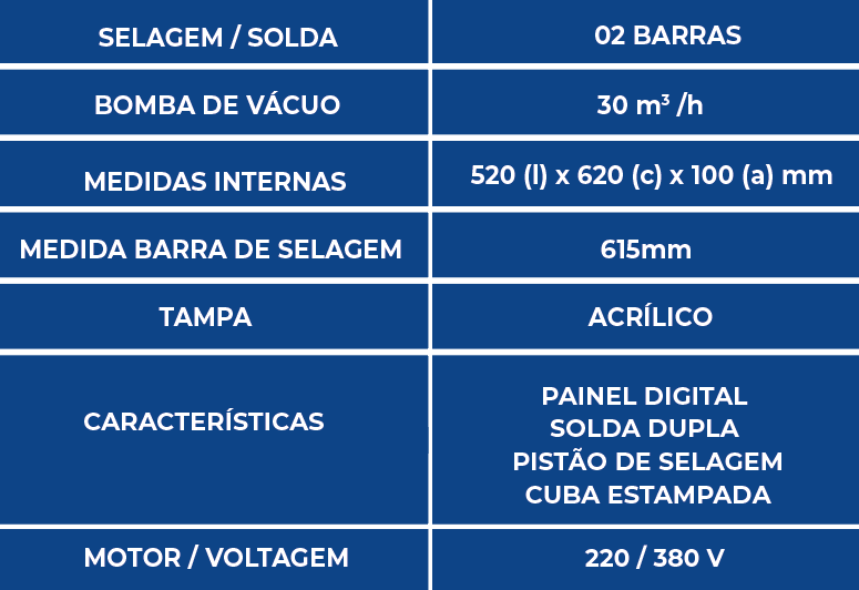 A embaladora a vácuo F620 pro com Cuba estampada oferece uma solução eficiente para preservar alimentos. Com suas duas barras de 620mm, garante versatilidade ao selar diferentes tamanhos de embalagens. A solda dupla proporciona maior eficiência e segurança no armazenamento, enquanto a potente bomba Busch assegura um vácuo rápido e confiável. Seu controle preciso através do painel digital torna a operação simples e precisa, garantindo a qualidade na conservação dos alimentos.